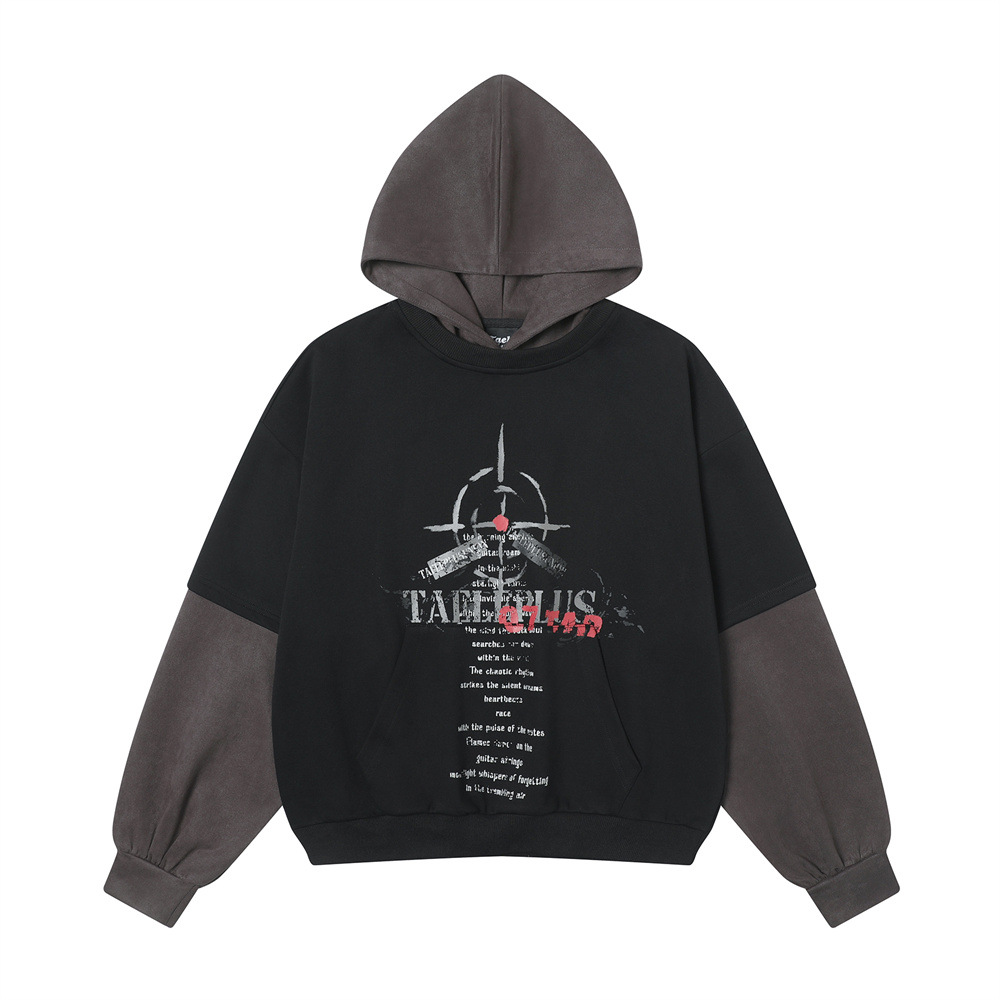 Men's spliced corded long-sleeve hoodie featuring a stylish design with contrasting fabric panels. Made from soft, breathable material for all-day comfort. Perfect for casual wear, workouts, or layeri